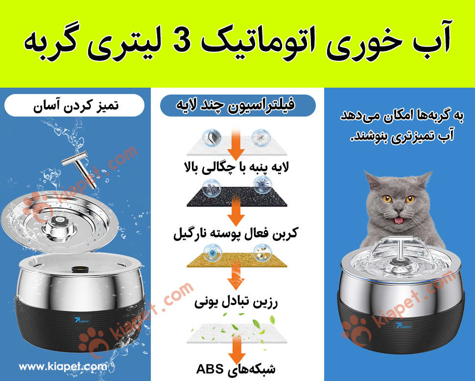 نوشیدن آب کافی، به خصوص آب تمیز و جاری، برای سلامت گربه ها حیاتی است و از بسیاری از بیماری ها، از جمله مشکلات کلیوی، جلوگیری می کند. دستگاه آبخوری و تصفیه آب گربه تمام استیل مدل آلبرت، با شبیه سازی یک چشمه طبیعی، پت شما را به نوشیدن آب بیشتر تشویق می کند. این دستگاه با طراحی زیبا، عملکرد بی صدا و جنس استیل ضد زنگ، بهترین انتخاب برای هر حیوانات خانگی است.