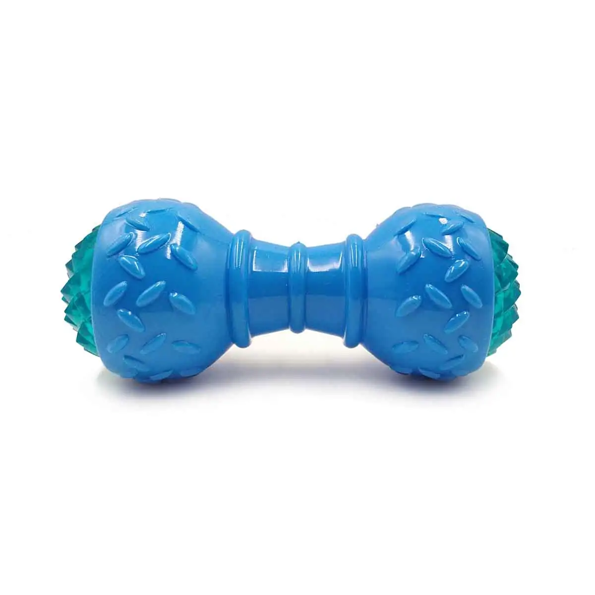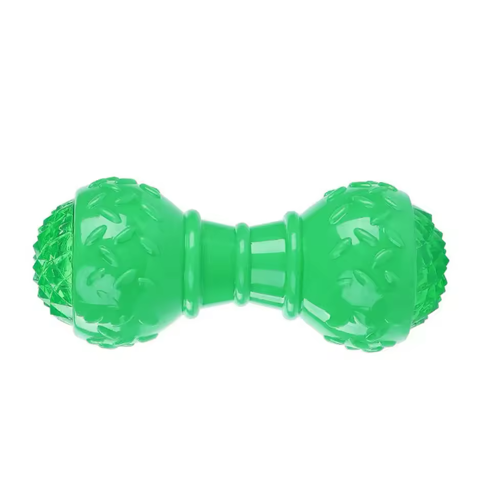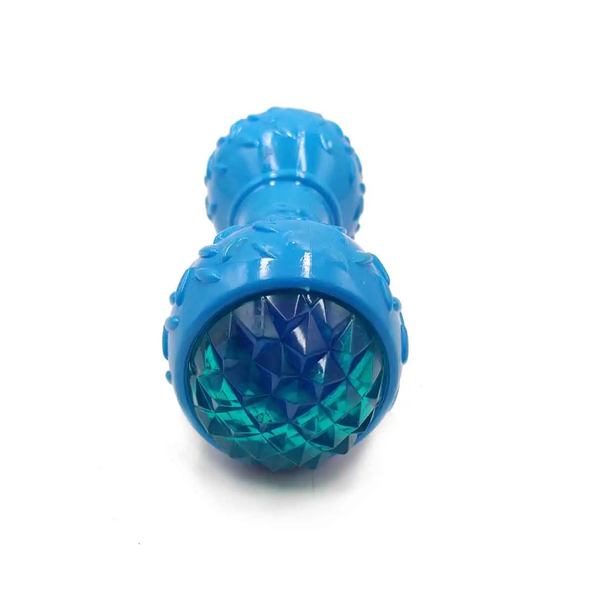 این محصول از جنس TPR (لاستیک ترموپلاستیک) ساخته شده که کاملاً سازگار با محیط زیست، غیرسمی و بسیار مقاوم در برابر گاز گرفتن است. طراحی دمبلی شکل آن به گونه ای است که سگ به راحتی می تواند آن را در دهان بگیرد، بجود و با آن بازی کند. وجود صدا و چراغ هنگام بازی، هیجان بیشتری ایجاد کرده و حس کنجکاوی سگ را تحریک می کند؛ به خصوص برای سگ هایی که زود حوصله شان سر می رود.