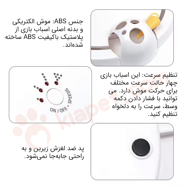 این اسباب بازی گربه دارای چهار حالت سرعت مختلف (کند، متوسط، تند و متغیر) است.