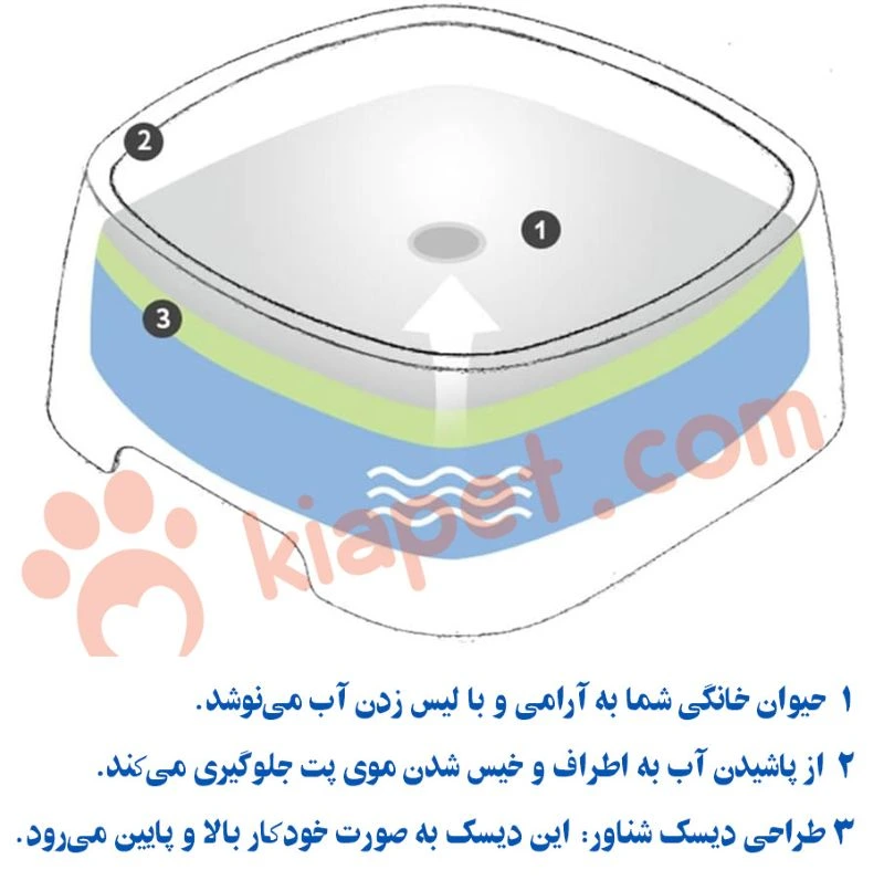 طراحی منحصر به فرد شامل یک صفحه شناور و سوراخ های کنترل جریان آب، از خیس شدن موهای اطراف دهان پت هنگام نوشیدن آب جلوگیری می کند.