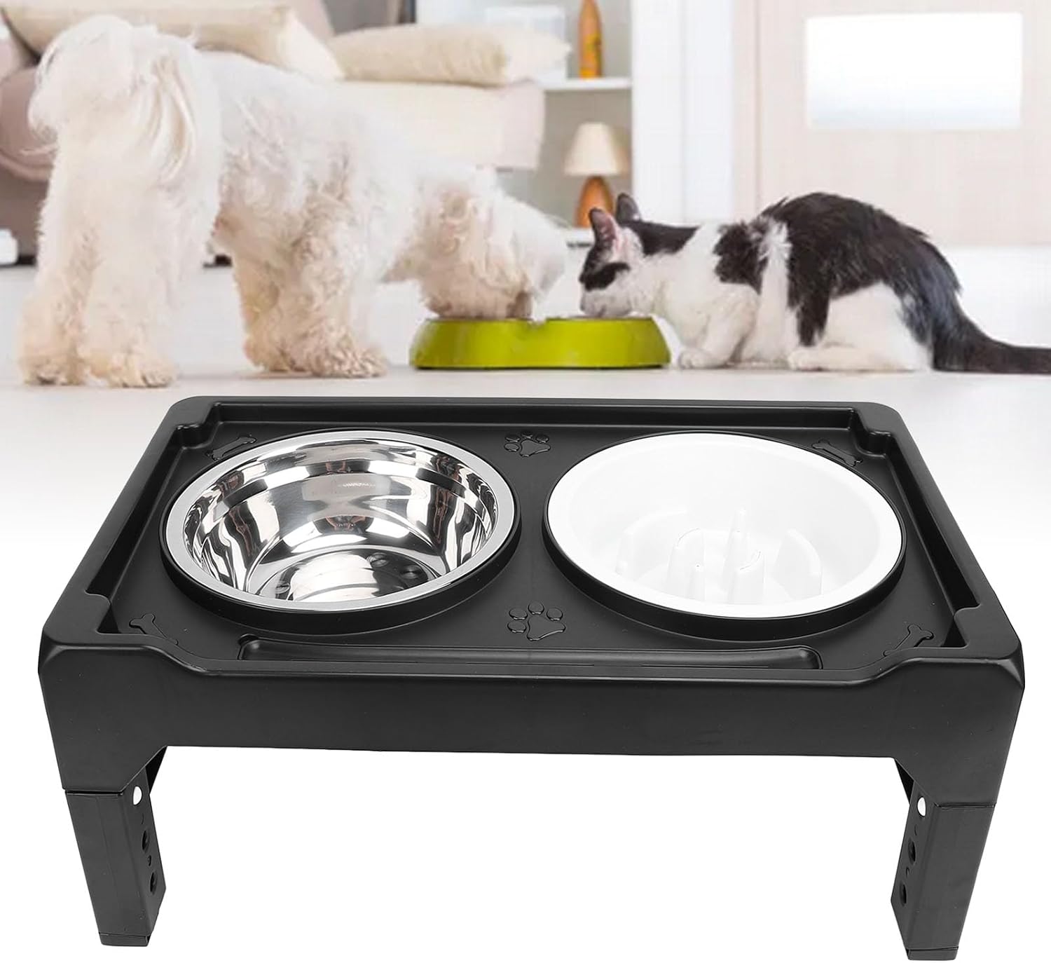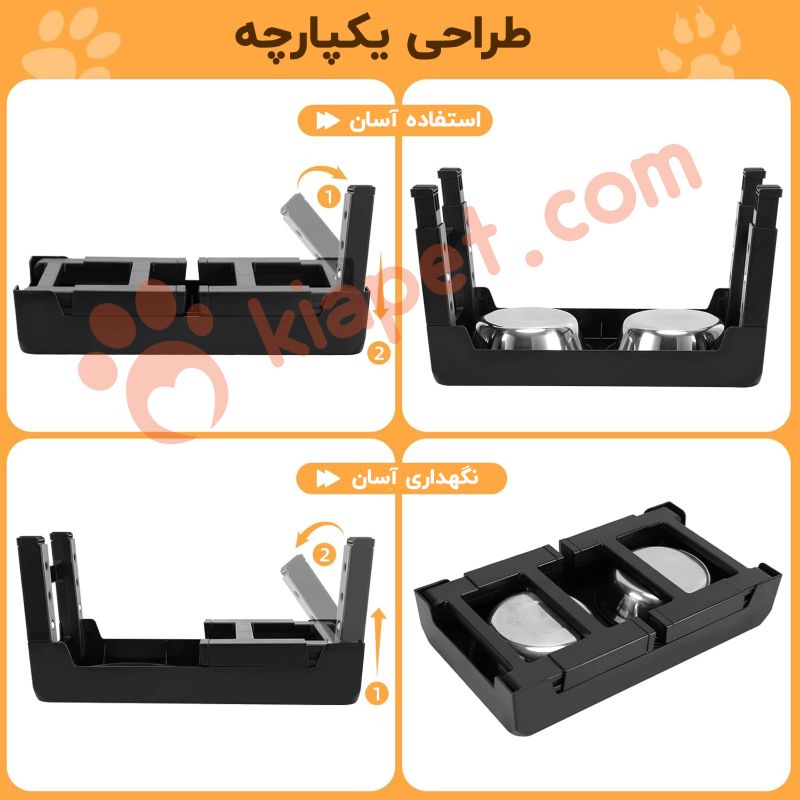 این محصول دارای دو کاسه مجزا است که نیازهای مختلف پت شما را برطرف می کند. یکی از کاسه ها از جنس استیل ضد زنگ است که برای سرو آب یا غذای خشک مناسب است. کاسه دیگر از نوع آرام خور (Slow Feeder) است که به کنترل سرعت غذا خوردن سگ های شکمو کمک کرده و از مشکلات ناشی از سریع غذا خوردن مانند خفگی یا استفراغ جلوگیری می کند. هر دو کاسه قابل جدا شدن و شستشو در ماشین ظرفشویی هستند.