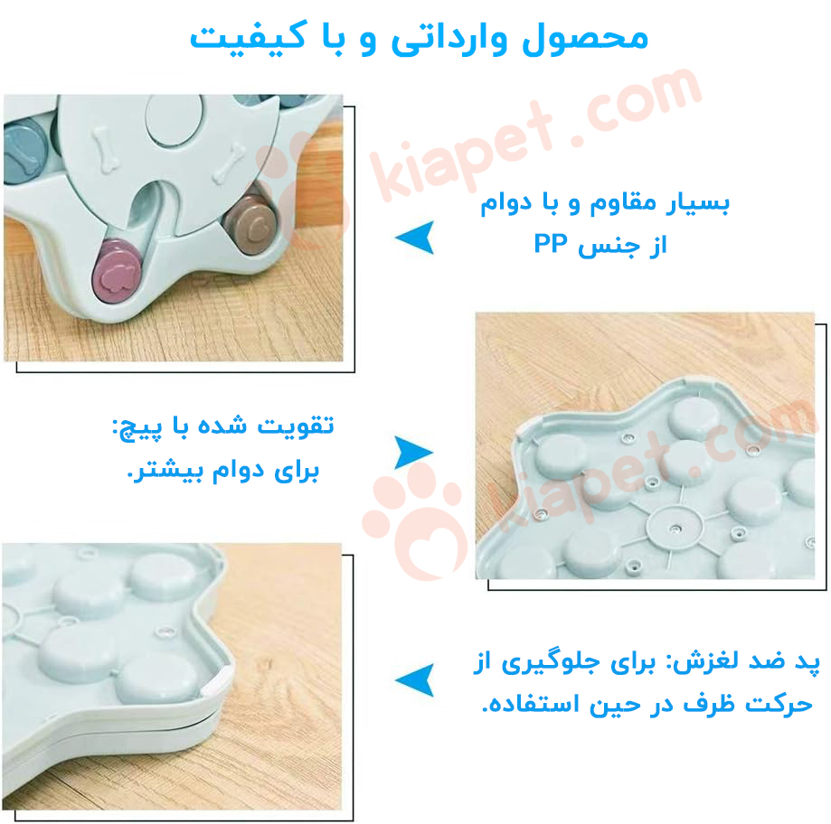 پدهای ضد لغزش در زیر ظرف، از حرکت آن در حین بازی پت جلوگیری می کند.